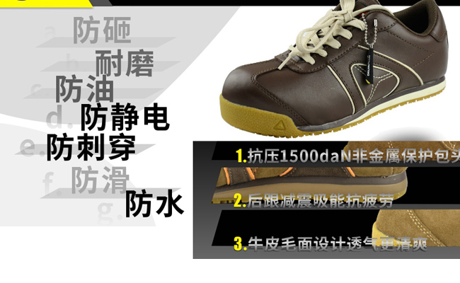 DS系列低帮简便透气安全鞋s3级防水,src级防滑鞋面:牛皮的第一层鞋垫:可拆除聚酯纤维amp;EVA。中底:能量缓冲吸收PU中底。外底:TPU橡胶牛津大底。非金属安全鞋。