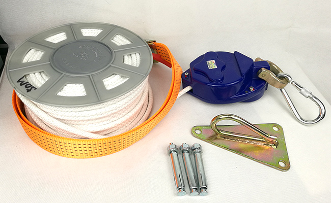 缓降器(消防救生软梯)符合GA413-2003救生缓降器的规范要求,它是用以高层建筑的往复式自救装置。它使用阻燃,耐磨,强度高的纯裸航空钢丝绳。